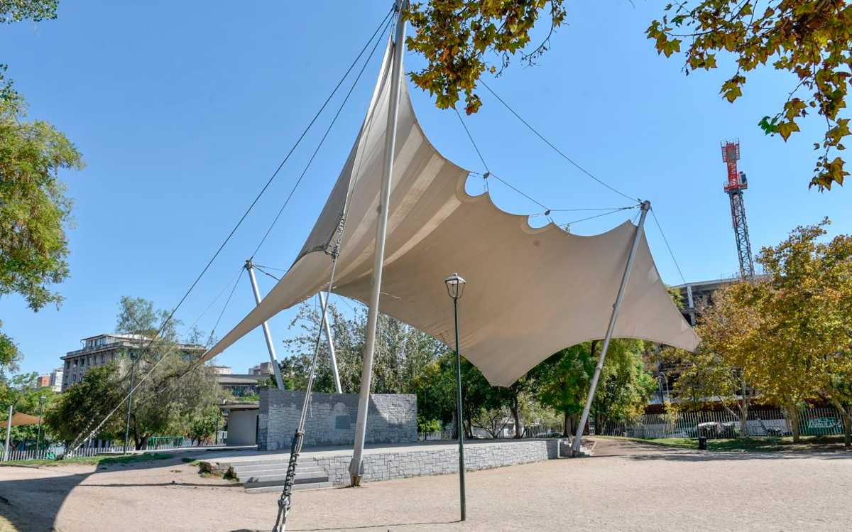 Ubicado en el corazón del Parque Bustamante, este Anfiteatro ha experimentado diferentes mejoras en el último tiempo (jardines sustentables, nuevos árboles y moderno mobiliario) pero faltaba uno de los más importantes: el cambio del emblemático toldo que cubre el escenario.
