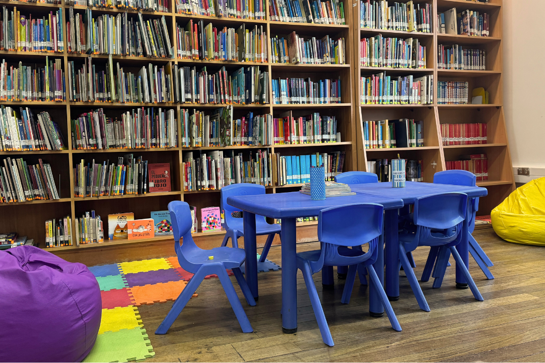 Al costado izquierdo se ubica la sala de lectura, con sofás en un ambiente amplio y acogedor. De manera independiente, la sala infantil está equipada con mobiliario adaptado para niños y niñas, tanto para lectura como para actividades.
